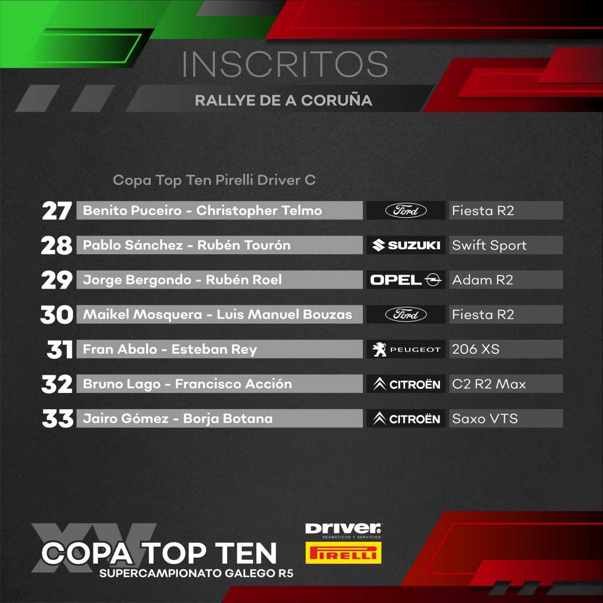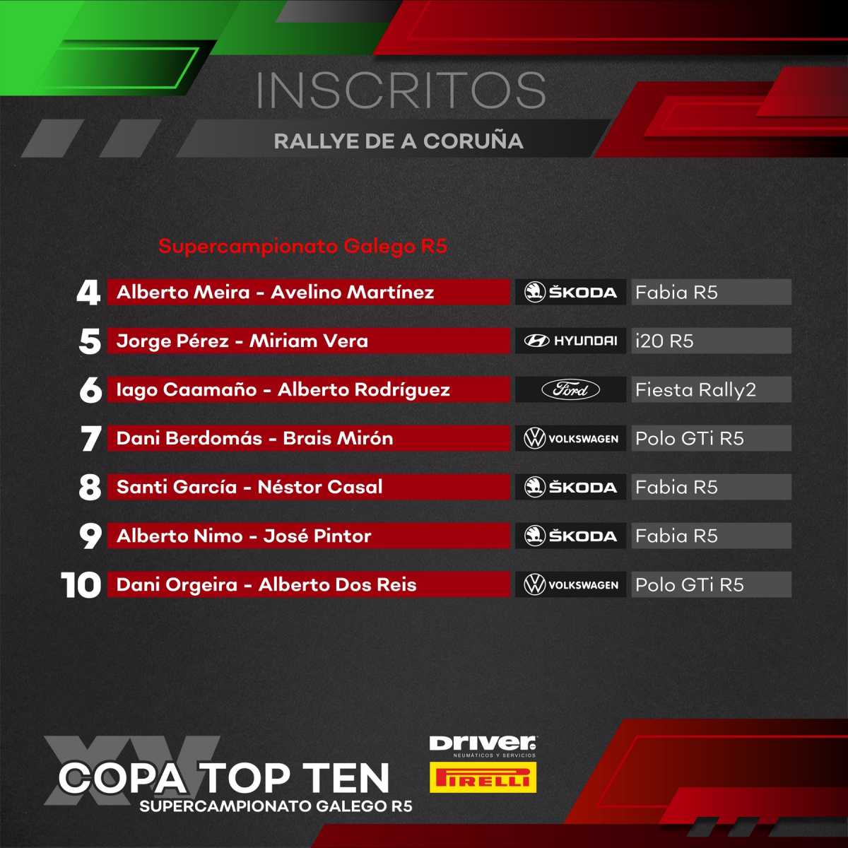 El Supercampionato Galego R5 gozará de una gran inscripción en este inicio, y junto al vigente campeón Alberto Meira estarán los habituales Pérez, Caamaño o Nimo, solo que ahora también hay que contar con Dani Berdomás, al volante de un Volkswagen Polo R5. También estarán presentes Santi García y Dani Orgeira, debutando a los mandos de máquinas R5 en la prueba de casa.