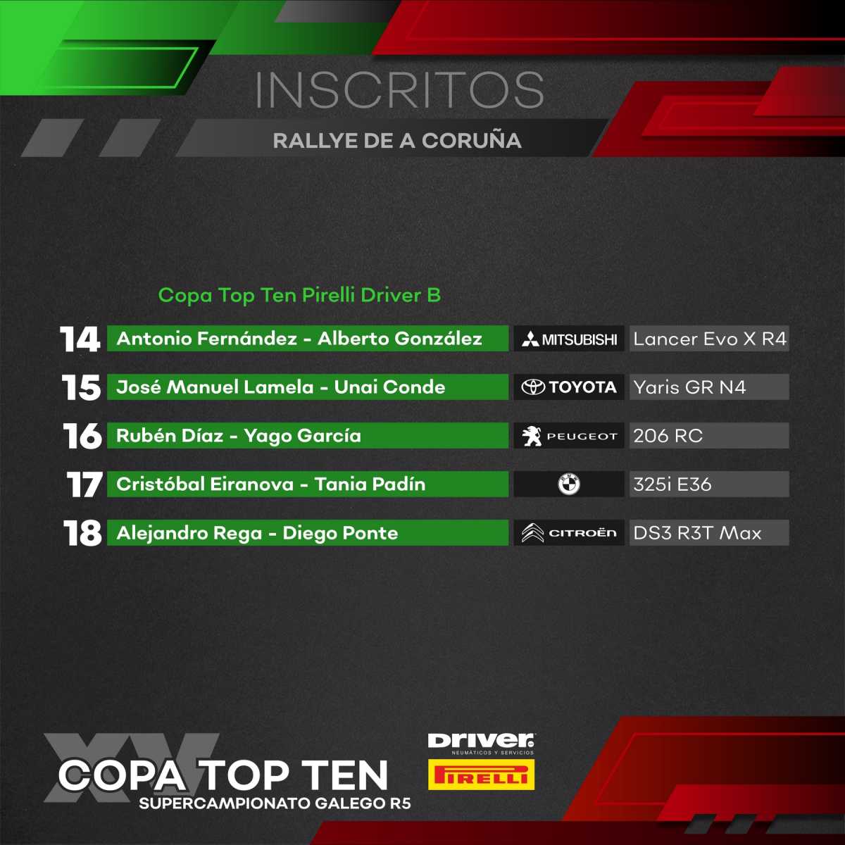 En lo respectivo a la Top Ten «B», la inscripción está encabezada por Antonio Fernández, que viene de ganar el Rallysprint de Piñor con su Mitsubishi. También estará presente Josito Lamela, defensor del título en esta copa y que probará su Yaris GR de la Toyota Gazoo Racing Iberian Cup sobre asfalto. También destaca la presencia de Alejandro Rega a los mandos del Citroën DS3 R3T Max que en su día pilotase Enrique García Ojeda.