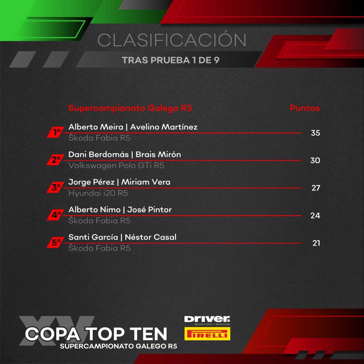 En el Supercampeonato Gallego R5, donde se preveía una cerrada lucha tras los apretados cronos del shakedown, era Iago Caamaño quien lograba el primer scratch de la temporada, pero un problema de motor le hacía perder terreno en el segundo tramo y finalmente abandonar. El testigo lo recogía Alberto Meira, quien fue el más regular de todos, poniendo tierra de por medio en la matinal sobre sus rivales, con problemas para Dani Berdomás (ligera salida) y Jorge Pérez (pinchazo).