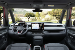Interior GTX: Volkswagen Comerciales también ha personalizado el equipamiento interior. Los tonos oscuros subrayan el carácter deportivo de los modelos ID. Buzz. Ambas versiones ID. Buzz GTX, con batalla tanto corta como larga, son los únicos modelos de la gama equipados con un revestimiento interior del techo negro. Los asientos también tienen el diseño específico de GTX. En la parte delantera, se utilizan asientos de confort ajustables eléctricamente con función de memoria. Los asientos se revalorizan con tapicerías de microfibra negra «ArtVelours Eco» con un nuevo diseño de rombos, costuras de contraste rojas y ribetes del mismo color. El volante multifunción se caracteriza por unas costuras en cruz rojas y se ve realzado por una aplicación roja en la barra central y la inscripción GTX cromada integrada.
