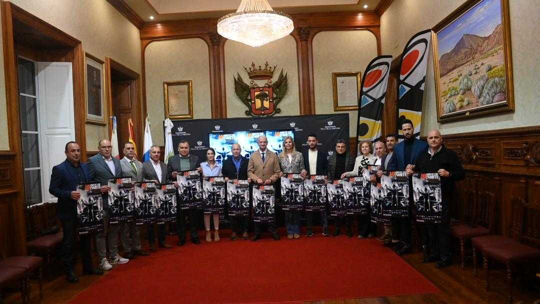 El encuentro con los medios de comunicación se llevó a cabo en el Salón de plenos del Ayuntamiento de La Orotava, con la presencia de un nutrido grupo de dirigentes públicos de todas las administraciones colaboradoras, encabezado por el alcalde anfitrión, Francisco Linares, y la consejera insular de Deportes, Yolanda Moliné.