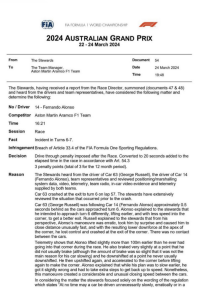 Fernando Alonso acabó sexto el Gran Premio de Australia, aunque tuvo que ir a reunirse con los comisarios tras una queja de Mercedes, que entendían que Alonso frenó mucho antes de lo debido provocando el error del británico George Russell, que sufrió un duro accidente a falta de una vuelta para el final, Tras escuchar a las partes, se le sancionó con 20 segundos, cayendo a la octava plaza.