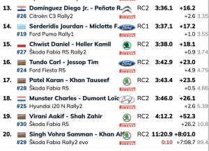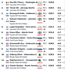 Elfyn Evans, actualmente segundo en la clasificación de puntos, fue sexto con su Toyota, seguido de cerca por el joven piloto de M-Sport Ford Puma Adrien Fourmaux. Gus Greensmith marcó el ritmo en el WRC2, situándose octavo en la general con un Škoda Fabia RS, mientras que Grégoire Munster y Oliver Solberg completaron el top 10.