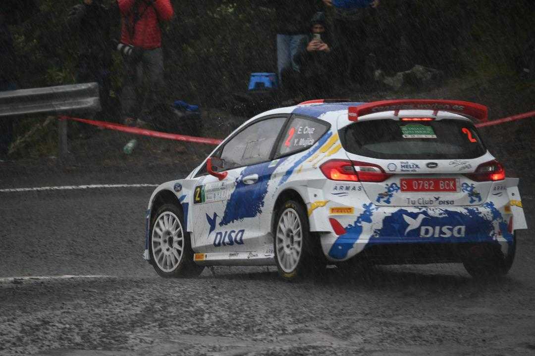 Posteriormente, mientras los equipos se encontraban en el parque de asistencias, las nubes comenzaron a descargar con fuerza sobre el Valle de la Orotava, donde en pocos minutos se iba a disputar el TC 4 “Camino de Chasna La Orotava-La Piñera Los Realejos”. Hacia allí partieron los del DISA Copi Sport calzados con neumáticos y configuración de lluvia en el Ford Fiesta Rally2. El objetivo era claro: obtener los puntos adicionales que otorgaba la victoria en este tramo, el TC Plus de la prueba. Pero en el intento, un inesperado aquaplaning provocó salida de pista de Cruz y Mujica dañando seriamente el coche y dando por terminado su rallye.