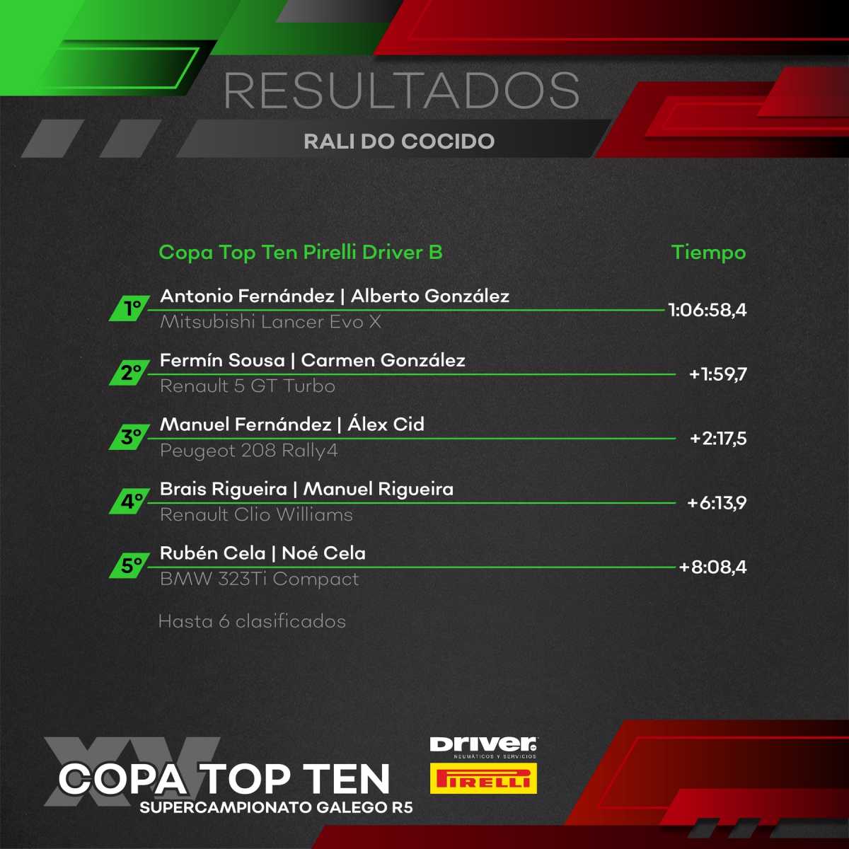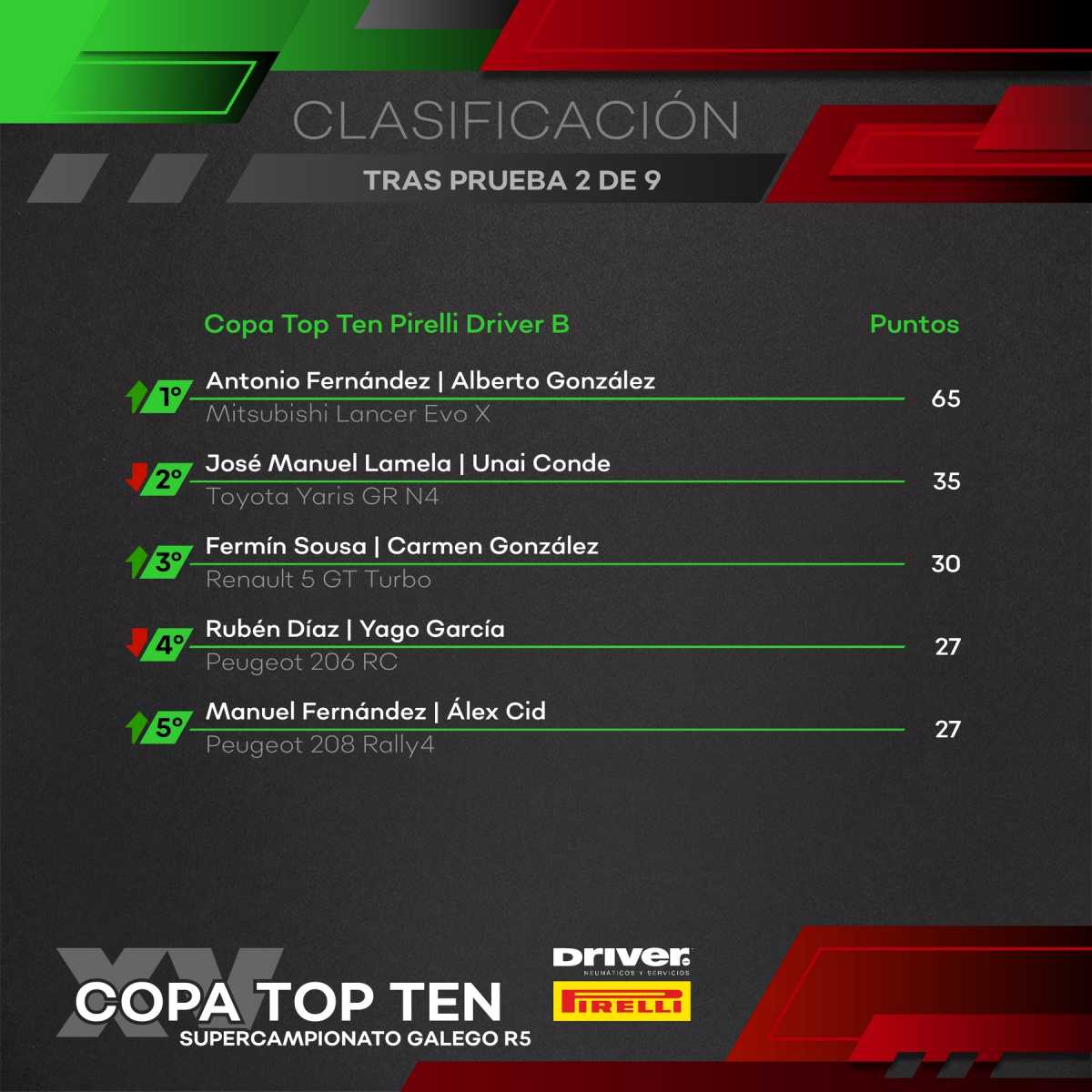 Dentro de la Copa Top Ten «B» Roberto Blach se mostró superior desde un inicio al volante del Citroën C3 N5, pero una salida en O Couto le llevaba al abandono con más de un minuto de ventaja sobre Antonio Fernández, que pasaba a comandar la tabla, con un ojo puesto en Tino Iglesias, que llegó a arrebatarle el liderato momentáneamente tras el primer tramo de la tarde. No obstante, el de Ribadumia abandonaba antes de la última sección con el motor de su Fiesta N5 sonando mal.