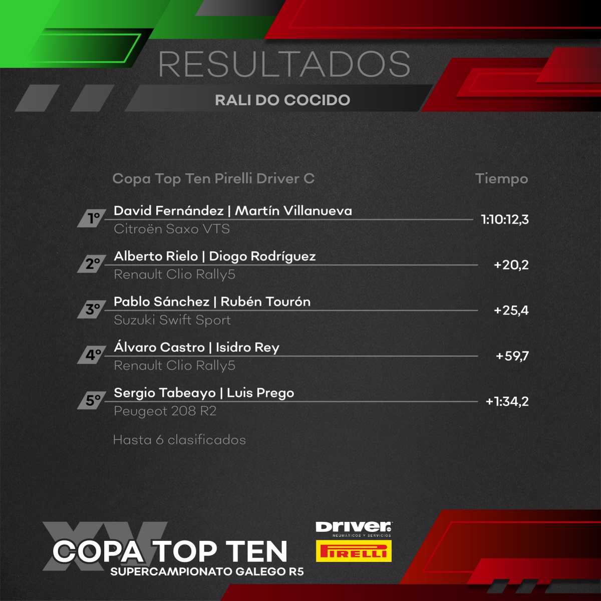 En lo que respecta a la Top Ten «C», jornada muy movida con cambios de posiciones continuos, comenzando con el abandono de Marcos Sanromán en la primera especial, o el de Daniel Montoto tras el tercer tramo después de ponerse líder. Estos sucesos dejaban a un sorprendente David Fernández en cabeza con su Saxo, quien se alió con lo delicado de los tramos para defenderse de los ataques de Alberto Rielo y de Pablo Sánchez, que le acompañaban en el podio. Cuarto finalizaba Álvaro Castro, el becado de la PXP24, quien a pesar de realizar el scratch inicial, su fase de adaptación al Clio le costó algunos sustos, precediendo a Risi Tabeayo, que cerraba el top 5.