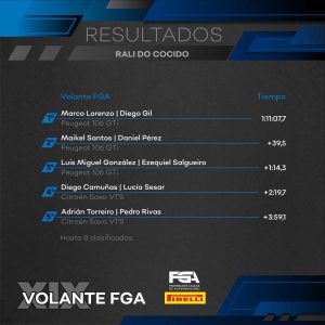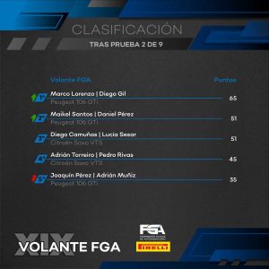 En la última sección, muy delicada, no hubo cambios de posición y Marco Lorenzo, acompañado por Diego Gil se hacía con su primer triunfo en su primera temporada dentro del Volante FGA, nuevamente ganando dentro de la Beca PXP25. Santos finalizaba segundo dando muy buena impresión (y teniendo en cuenta que por la mañana cedía 40 segundos de penalización tras negarse a arrancar su coche). Muy buena actuación de Luis González, quien terminaba tercero y rodando en cronos cercanos al dúo de cabeza.