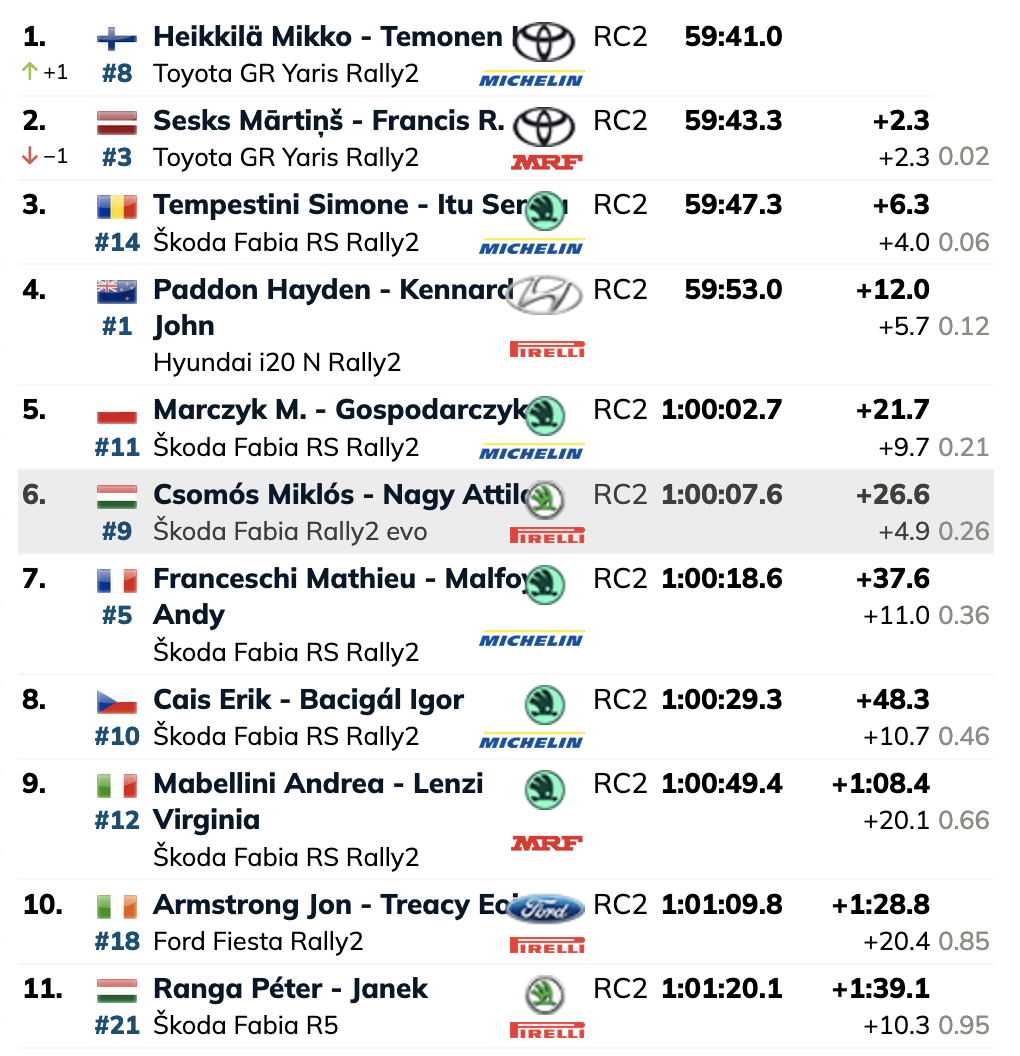 Simone Tempestini consiguió una victoria de etapa en su luchar por el tercer puesto con el Fabia de última generación de Škoda. El múltiple campeón rumano está 5,7 segundos por delante del ganador del título ERC del año pasado, Hayden Paddon, que con un Hyundai i20 N Rally2 equipado con Pirelli es cuarto.
