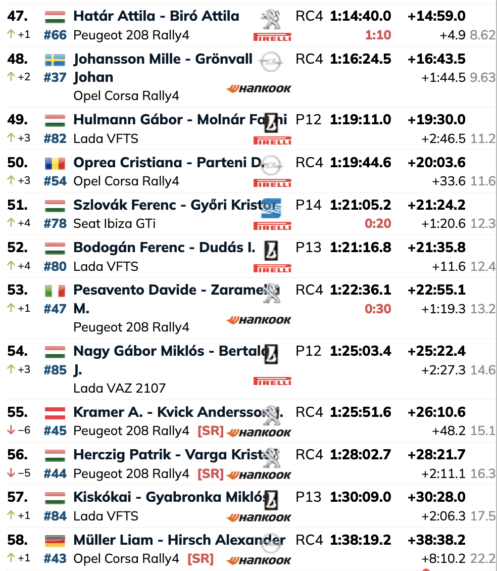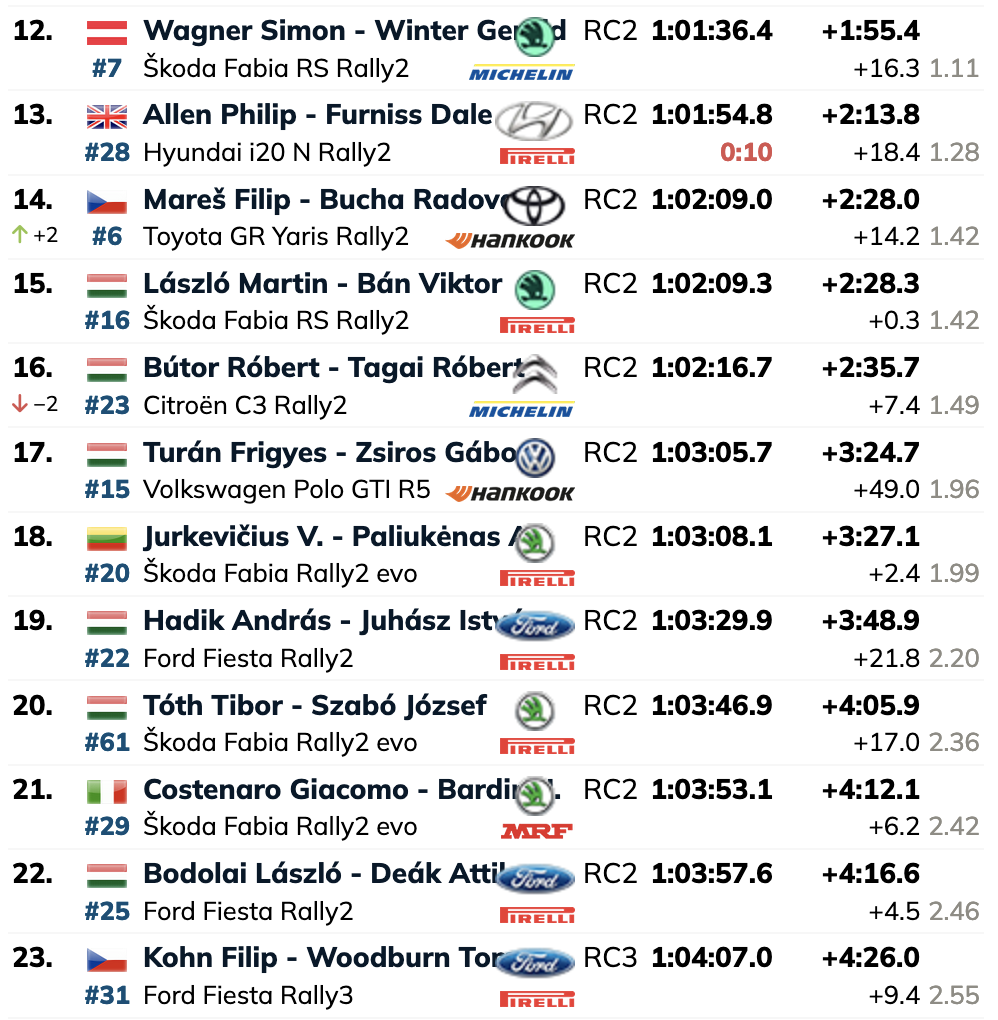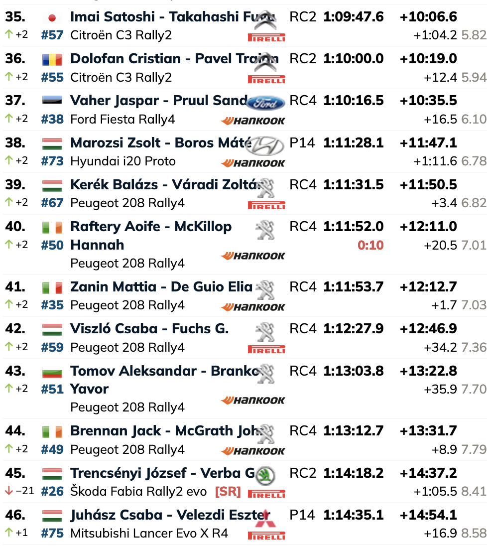 Frigyes Turán, el ganador del Rally de Hungría en 2019, se retrasó por un pinchazo en la parte trasera izquierda en el TC3 y un problema de dirección asistida en el TC4. Como resultado, está en el puesto 17.