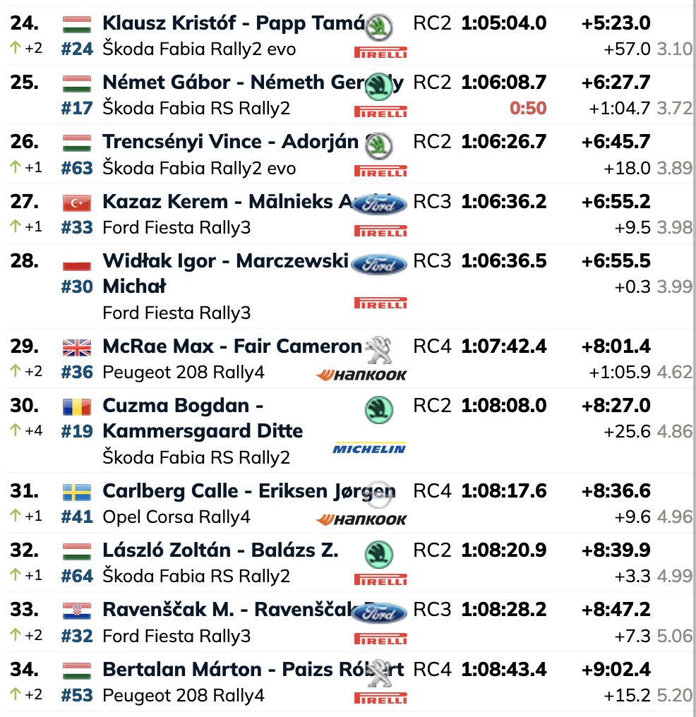 Después de ganar la súper especial del viernes por la noche, Erik Cais culpó a las «notas pesimistas» por no poder replicar su velocidad inicial en el rally. El checo es octavo después de siete etapas, por delante de Andrea Mabellini en el TC6, después de que el italiano se retrasara por el polvo levantado por Kristóf Klausz, que se había detenido para cambiar una rueda.