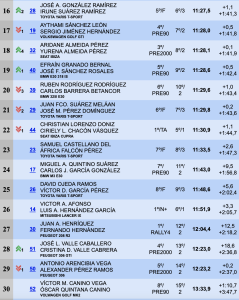 Los grancanarios Ayoze Benítez y Patricia González (Porsche 997 GT3 2010) son terceros a 23.6 y superando en 1.7 a el campeón de Canarias de Rallysprint de las dos últimas temporadas, el tinerfeño Fran Suárez, en esta ocasión junto a Alejandro Rodríguez en su Ford Fiesta R5 MKII, cuartos de la general.