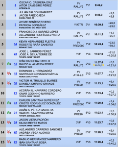 Cabrera y Cambeiro dos de los tres tramos. Fueron los más rápidos en los dos primeras, logrando superar en la general en 3.7 a los grancanarios Julián Falcón y Jacob Páez en su estreno con el nuevo Skoda Fabia R5, pero en el tercer tramo los locales fueron los más rápidos, logrando recortarles 0.9 a los del Citroën, que eran segundos de la crono.