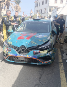 Los grancanarios Manuel Hernández y David Bethencourt tenían una ligera salida de carretera, golpeando su Renault Clio Rally5 contra un poste con mucho cableado, que caía y se quedaba con todo el cableado en medio de la carretera, por lo que el tramo se ha neutralizado.