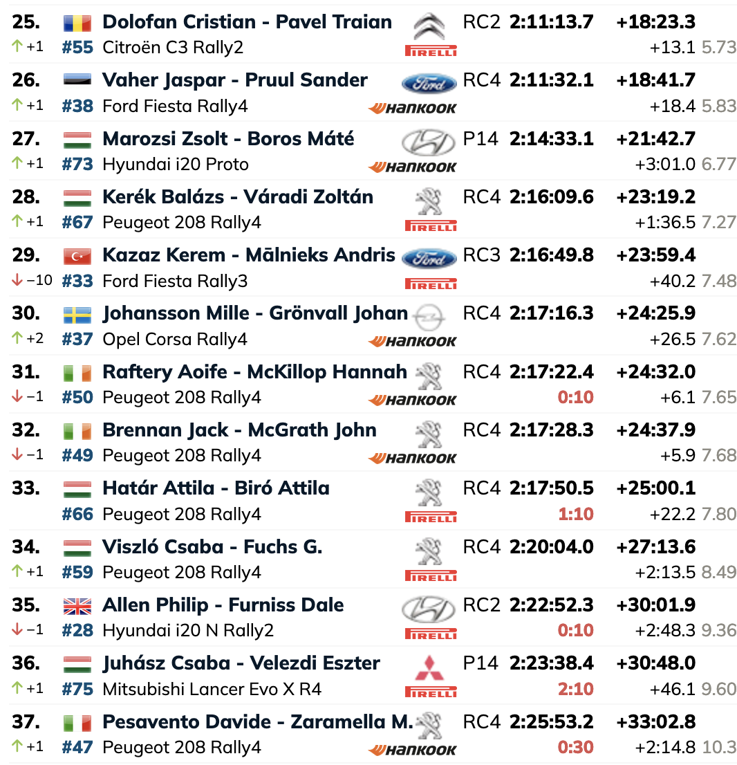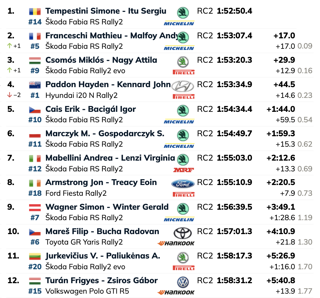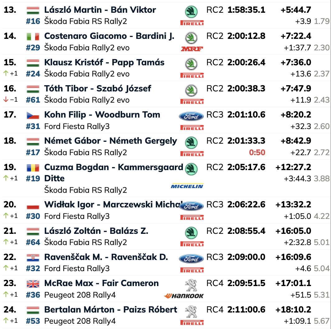 Filip Mareš completó el top 10 al volante de un Toyota Yaris Rally2 equipado con Hankook, seguido por el finalista del Rally Dakar, Vladas Jurkevičius. Frigyes Turán superó a Martin László hasta acabar en el puesto 12 con 3,9 segundos delante de que su compatriota húngaro perdiera tiempo con un costoso trompo en el TC12. Giacomo Costenaro, en su primera prueba en el ERC desde 2016, y Kristóf Klausz, completaron el top 15 provisional.