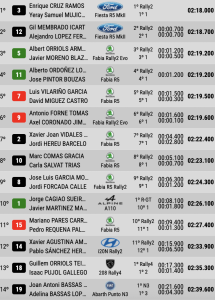 Terceros son los catalanes Albert Orriols y Javier Moreno (Skoda Fabia Rally2 Evo), a 1,2, empatados con el asturiano Alberto Ordóñez y José Pintor (Skoda Fabia R5)