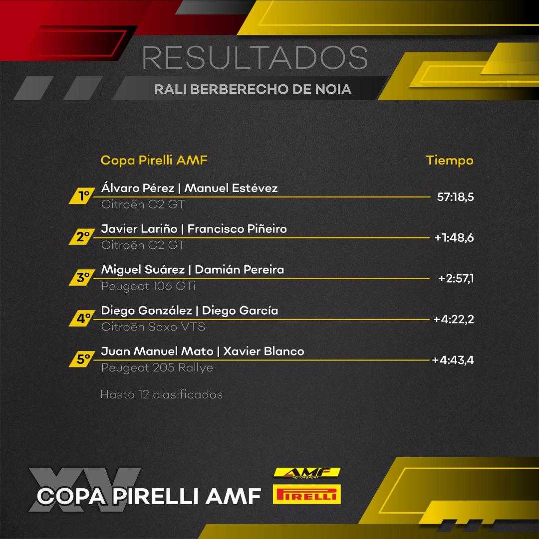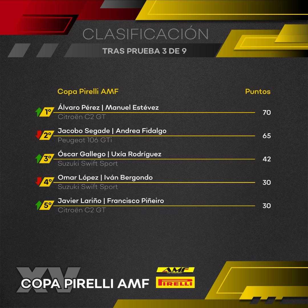 Se prometía una tarde muy emocionante con el duelo entre Pérez y Conde, pero este último cometía un error en la antepenúltima especial, saliéndose a un campo y dañando su vehículo, sin posibilidad de regresar al asfalto. Esto dejaba el camino expedito para que Álvaro Pérez y Manuel Estévez se anotasen la segunda victoria del año, asaltando así el liderato de la Copa Pirelli AMF.