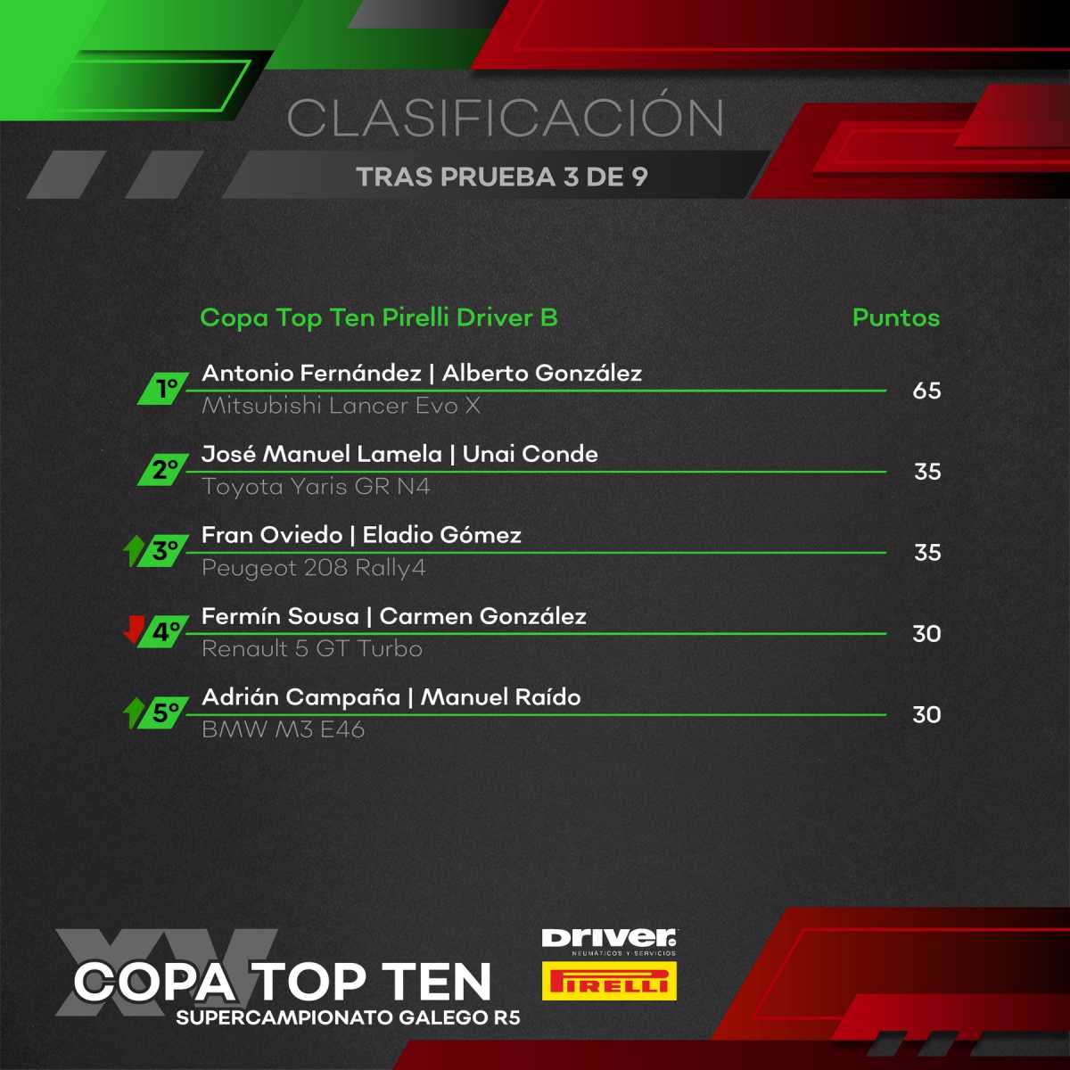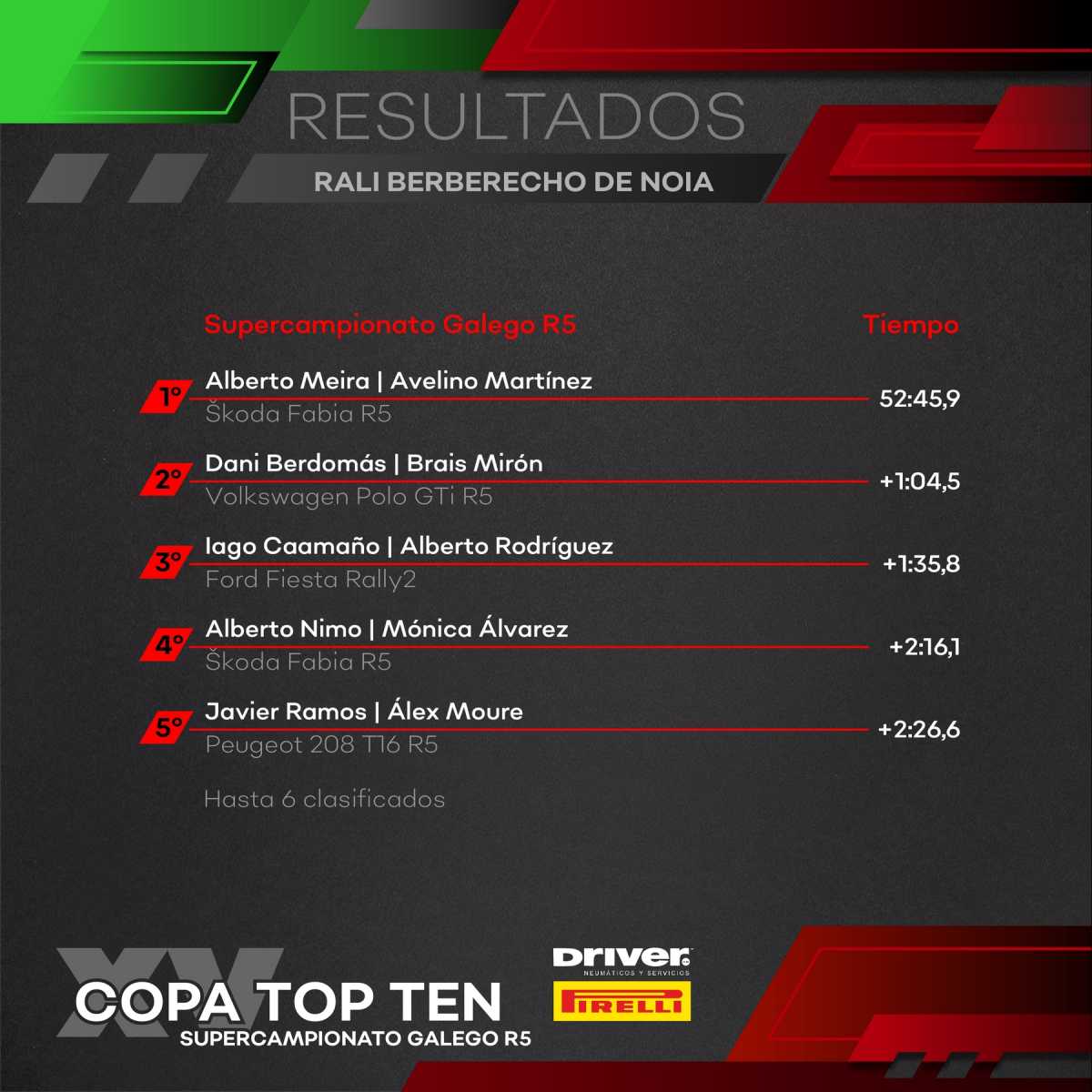 En el Supercampeonato Gallego R5, al igual que sucedió en Lalín, Dani Berdomás lanzaba un duro ataque desde el inicio, adjudicándose los tres primeros scratchs y distanciando a Alberto Meira hasta los siete segundos, con Iago Caamaño y Jorge Pérez rondando el medio minuto de desventaja. La gran clave de la jornada estuvo en la segunda pasada por el tramo de Brión, donde pinchaban Caamaño (46 segundos de pérdida), Berdomás (un minuto) y Pérez (más de tres minutos después de parar a cambiar la rueda).