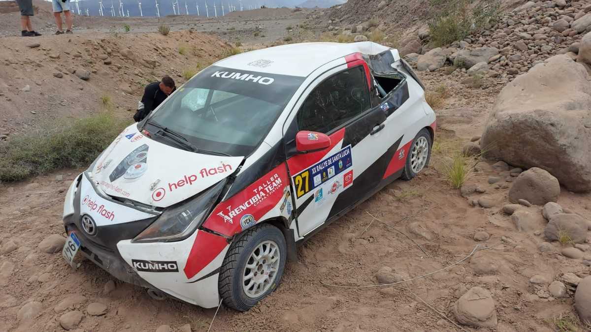 Airám Montesdeoca y Juan Jesús Díaz (Toyota Aigo) sufrieron una salida de carretera en el Rallye de Tierra de Santa Lucía de Tirajana 2024, pero ambos están bien.