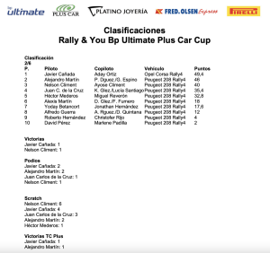 Por su parte, Alejandro Martín, junto a Gabriel Espino, ha comenzado la Rally & You Bp Ultimate Plus Car Cup con la regularidad como principal arma. Su segundo podio consecutivo, unido a algún scratch, entre ellos el TC Plus, le mantiene conectado muy cerca de la primera posición al tiempo que ultima su adaptación al Peugeot 208 Rally4.