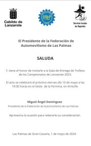 La Federación Interinsular de Las Palmas convoca al colectivo del automovilismo de Lanzarote para su Gala de Campeones 2023, en la que se entregarán los trofeos del Campeonato Insular.