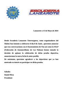 La Escudería Lanzarote informa sobre el aplazamiento del Slalom San Antonio en Tías, prueba prevista para el 8 de junio. El presidente Dani Mesa pide disculpas y ya se informará de la nueva fecha y novedades.