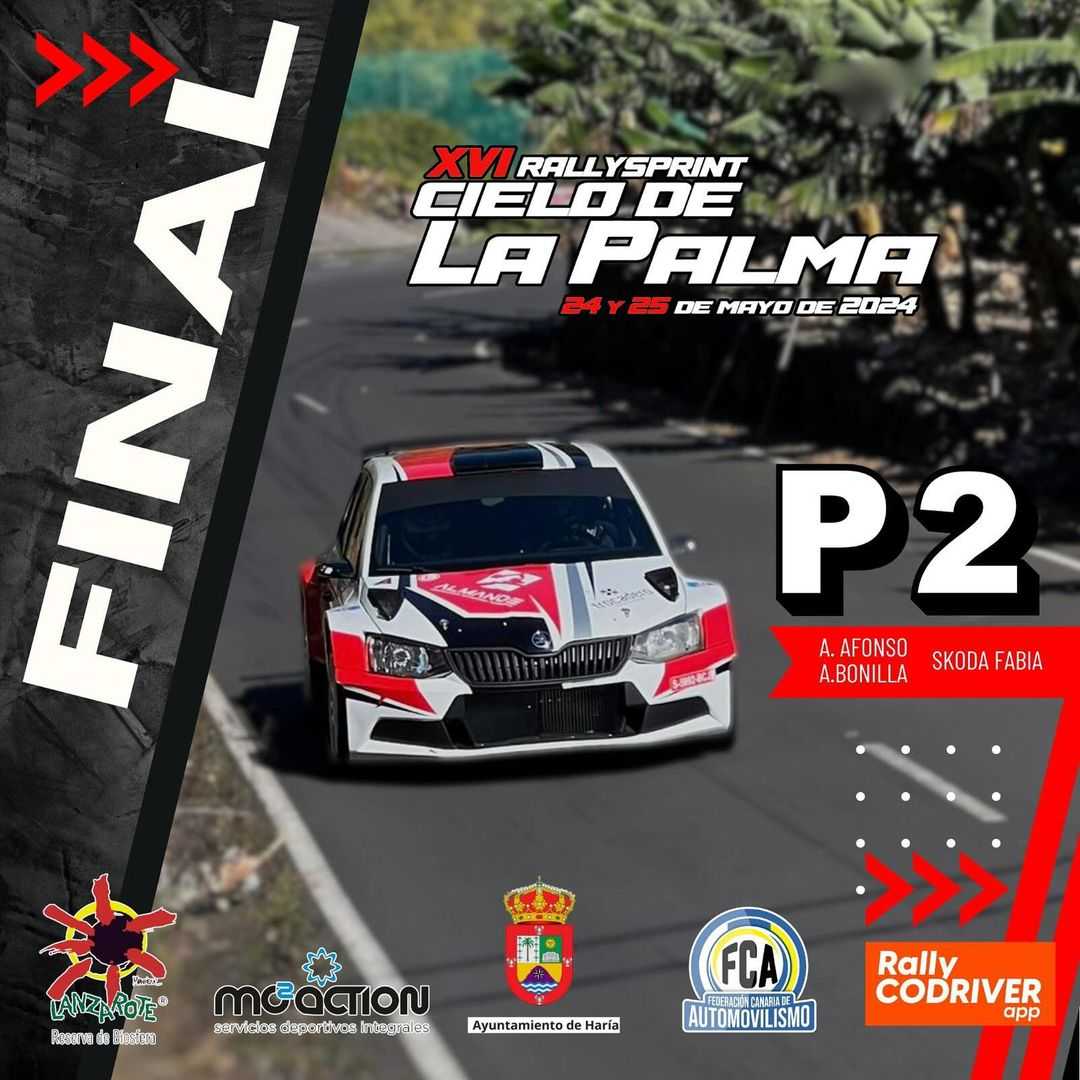 Segunda posición para el palmero Alejandro Afonso y el lanzaroteño Ariday Bonilla (Skoda Fabia R5) en el RallySprint Cielo de La Palma 2024. Empezaron siendo terceros en los dos tramos del viernes, pero el sábado lograron asaltar la segunda posición.