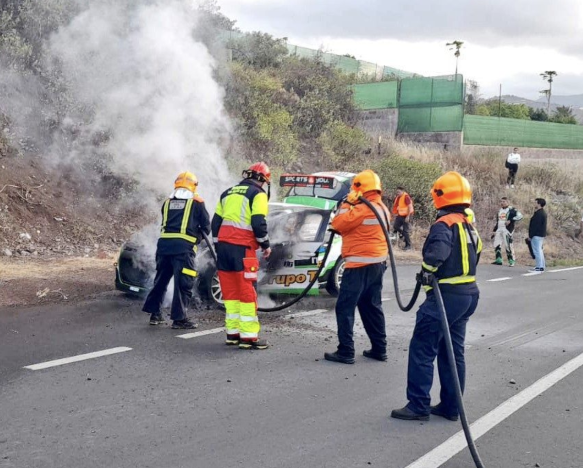 La rápida llegada de los bomberos evitó que la montura de Sports & You Canarias ardiera en su totalidad, pero ha quedado seriamente dañada, no pudiendo continuar en carrera.