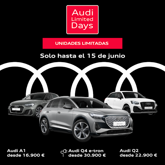 Sin duda, Audi Limited Days es la oportunidad perfecta para dar el salto a la movilidad premium en cualquiera de sus vertientes. Hasta el próximo 15 de junio, diseño, tecnología, conectividad, deportividad y sostenibilidad están al alcance de todos los clientes con descuentos irrepetibles en unidades limitadas. Los interesados pueden acudir a cualquier concesionario de la Red Oficial de Audi en Canarias para conocer más sobre esta promoción o solicitar información a través de las redes sociales y página web de Audi Canarias. Pide tu cita a través del siguiente enlace y disfruta del Audi de tus sueños ahora mismo: https://formulario.audicanarias.com/audi-limited-days