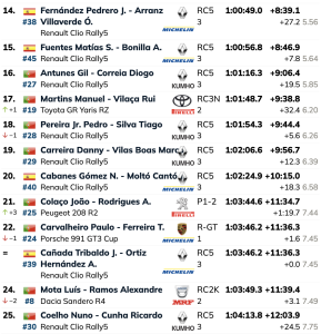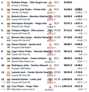 El asturiano Diego Ruiloba y Ángel Luis Vela lograron llevar el Citroën C3 Rally2 al triunfo en elRally de Lisboa al superar en 2:28.1 a los lusos José Pedro Fontes e Inés Ponte, con otro Citroën C3 Rally2.
