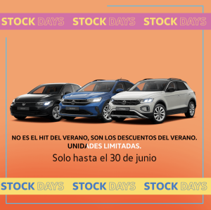 Sin lugar a dudas, los Stock Days de Volkswagen Canarias son una nueva apuesta de la marca por sus clientes ofreciendo la mejor movilidad al mejor precio. Hasta el 30 de junio, los interesados pueden visitar cualquiera de los concesionarios de la red oficial de Volkswagen en el archipiélago o acceder a www.vwcanarias.com para descubrir las ventajas y condiciones irrepetibles de esta acción y hacerse con el Volkswagen de sus sueños.