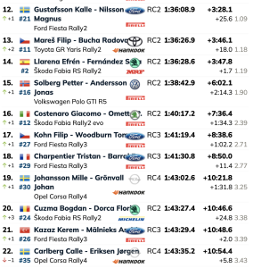 Un trompo de Frank Tore Larsen en el TC12 resultó costoso cuando el noruego perdió casi 18 segundos intentando que su Volkswagen Polo GTI R5 apuntara en la dirección correcta. Pero recuperó la compostura para terminar cuarto mientras Mads Ostberg luchaba contra problemas de manejo y potencia para terminar quinto con su Citroën C3 Rally2 del TRT Rally Team.