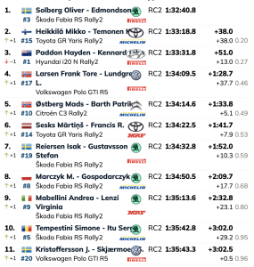 Conduciendo un Škoda Fabia RS Rally2 con neumáticos Pirelli, Solberg fue el más rápido en los cuatro tramos de la mañana del sábado para llegar a la asistencia del mediodía en Karlstad con una ventaja de 13,7 segundos.