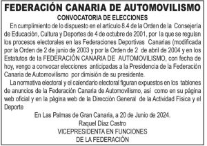 En cumplimiento de lo dispuesto en el artículo 8.4 de la Orden de la Consejería de Educación, Cultura y Deportes de 4 de octubre de 2001, por la que se regulan los procesos electorales en las Federaciones Deportivas Canarias (modificada por la Orden de 2 de junio de 2003 y por la Orden de 2 de abril de 2004 y en los Estatutos de la FEDERACIÓN CANARIA DE AUTOMOVILISMO, con fecha de 20 de junio, vengo a convocar elecciones anticipadas a la Presidencia de la Federación Canaria de Automovilismo por dimisión de su presidente.