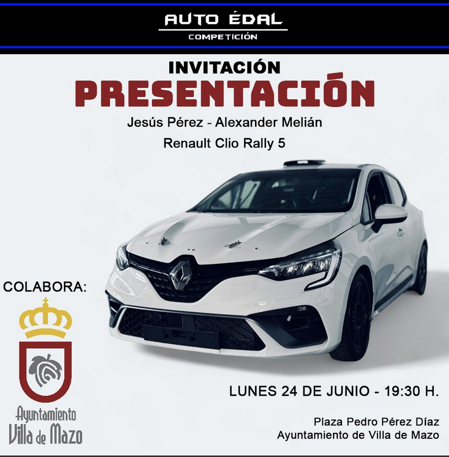 Se realizará el lunes 24 de Junio, a partir de las 19:30 horas, en la Plaza Pedro Pérez Díaz, en el Ayuntamiento de Villa de Mazo, donde habrá una rueda de prensa y se desvelarán los colores del nuevo Renault Clio Rally 5 con el que competirán.