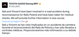 «Seb y Vincent se han visto implicados en un accidente de tráfico durante los reconocimientos del Rally de Polonia y han sido llevados a hacerse los chequeos médicos. Proporcionaremos más información a su debido tiempo», detalla el comunicado del equipo Toyota.