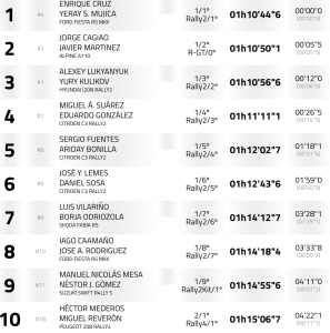 El último escalón del podio fue finalmente para los rusos Alexey Lukyanuk y Yury Kulilov (Hyundai i20N Rally2), que si no llega a ser por la penalización de 10 segundos habrían estado en la lucha por el triunfo. Mantuvieron una bonita lucha por el último escalón del podio con los campeones de Canarias 2023, el palmero Miguel Suárez y el grancanario Eduardo González (Citroën C3 Rally2), que finalmente fueron cuartos a 14.5 del tercer puesto.