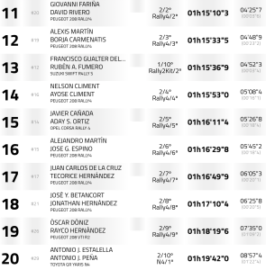 La novena plaza para los tinerfeños Manolo Mesa y Néstor Gómez (Swift R4lly S), que estuvieron durante toda la jornada manteniendo una muy apretada lucha con Walter Delgado y Rubén Fumero, con otro Swift R4lly S, pero al final los segundos cayeron a la décimo tercera plaza de la general.