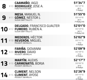 Desde la undécima plaza hasta la novena ascienden Manolo Mesa y Néstor Gómez (Swift R4lly S), seguidos muy de cerca de Walter Delgado y Rubén Fumero, con otro Swift R4lly S, que están a seis segundos de los anteriores cerrando el top 10.