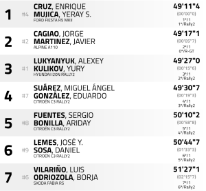 Las siguientes posiciones las diferencias con los anteriores y predecesores son importantes, por lo que, salvo problema mecánico o fallo, tienen pinta de tener poco movimiento. Con los abandonos de Alberto Ordóñez – José Pintor (Skoda Fabia R5) y Miguel Fuster – Alba Sánchez (Citroën C3 Rally2), la quinta plaza es para el tinerfeño Sergio Fuentes y el lanzaroteño Ariday Bonilla (Citroën C3 Rally2), que superan en 33.5 al lanzaroteño Yeray Lemes y el grancanario Daniel Sosa (Citroën C3 Rally2),, sextos. Séptimos son Luis Vilariño y Borja Odriozola (Skoda Fabia R5), seguidos de Iago Caamaño y José Alberto Rodríguez (Ford Fiesta R5 MKII).