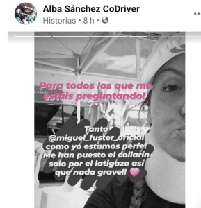 La copiloto leonesa Alba Sánchez, que junto al piloto alicantino Miguel Fuster sufrían una salida con su Citroën C3 Rally2 en el Rally Villa de Adeje, tranquilizó a sus seguidores en las redes sociales.