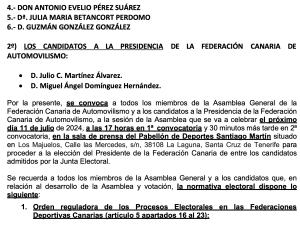 Estaba previsto que este próximo domingo, nuevamente en la isla de Tenerife, se decidiera el nombre del nuevo presidente de la Federación de Canaria de Automovilismo (FCA), pero, motivos de traslados y regreso de asamblearios, según hemos podido saber, imposibilitarán que se lleve a cabo este domingo, 7 de julio, y se traslade al jueves 11.
