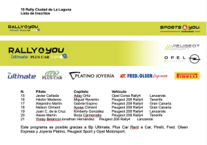 Los equipos de la Rally & You Bp Ultimate Plus Car Cup iniciarán la competición en la noche de este viernes con la especial ‘Ciudad de La Laguna’ (1,76 km a las 20:45 h). El grueso de la competición se desarrollará al día siguiente con las especiales de ‘Villa de Tegueste’ (10,06 km a las 8:40 h y 12:10 h), ‘Valle de Guerra’ (14,76 km a las 9:15 h y 12:45 h), ‘Tacoronte – El Rosario’ (8,4 km a las 10:00 h, 13:30 h y 16:25 h) y ‘Candelaria’ (8,82 km a las 17:15 h). En total serán 85,42 km de recorrido cronometrado.