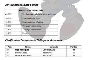Santa Comba vuelve al certamen autonómico tras casi diez años sin competición en su circuito de Autocross, una cita que ha sido recuperada por la escudería SC Motorsport. A esta cuarta cita del Campeonato Gallego de Autocross llega el joven piloto chantadino, Iago Rodríguez, como líder tras haberse impuesto a bordo de su La Base X01 en dos de las tres pruebas celebradas, por lo que el piloto de La Base Motorclub intentará aumentar su ventaja al fren de la clasificación.