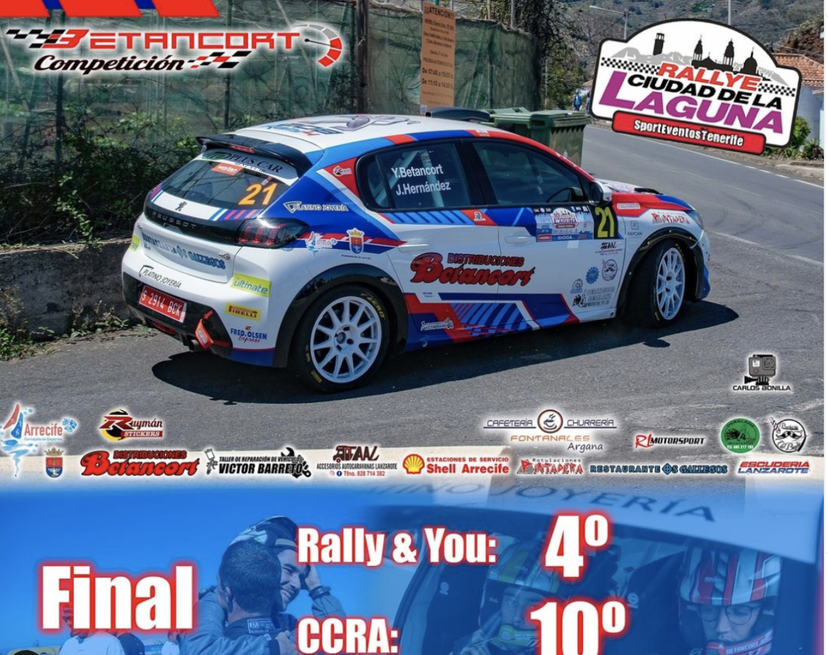 El Rally Ciudad de La Laguna, en la isla de Tenerife, ha sido el mejor rally para el lanzaroteño Yoday Betancort y el majorero Jonathan Hernández con el Peugeot 208 Rally4, acabando décimos de la general y cuartos de la Rally Cup.