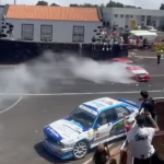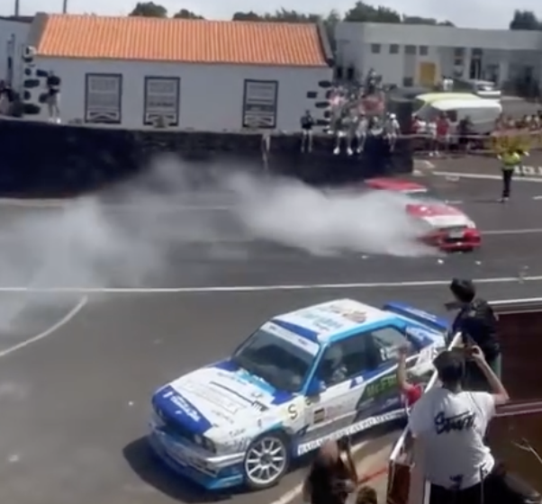 Miguel, que competía en el apartado de Fórmula Rallye, quizo entrar de lado, buscando la máxima espectacularidad, pero se salió de la trazada y fue dirección hacia la entrada de la gasolina, fuera del recorrido, Esperó a que pasara otro equipo participante que venia justo detrás de ellos, puesto que cada uno sale cada 30 segundos, como ocurrió con Armando Díaz y Elena Pérez, que entraron de lado con su BMW E30 325i y les sobrepasaban.