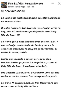 Como publican en el grupo Fans & Afición Huracán Monzón, el piloto satauteño está a la espera de que le lleguen algunas piezas para poder tener su C3 Rally2 a punto y así regresar a los rallys, pero no sabe cuándo podrá ser. Si por él fuera sería en el Villa de Teror, pero como no depende de él habrá que seguir esperando por el regreso del dos veces campeón de España de Rallys de Asfalto.