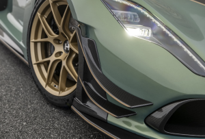 Franja de acento dorada: divisor delantero; almeja delantera, borde de fibra de carbono; umbrales de las puertas; entrada de aire en el techo; cubierta trasera, borde de salida de la cubierta del motor; difusor trasero, superficie que traza la parte trasera