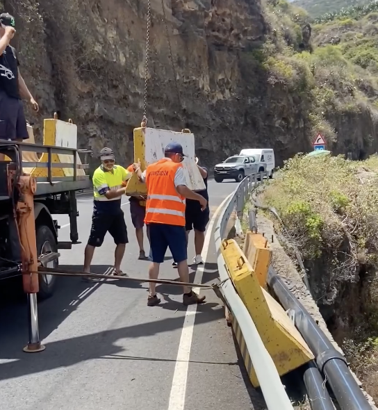 Lo que muchos no valoran, pero el equipo de esta Escudería La Palma IslaBonita logra en tiempo récord montar estas barreras de hormigón después de que Tito Correa tuviese un accidente y rompiera el vallado de la carretera. todo por la seguridad de los participantes y gracias a esa actuación y montaje, un equipo escapó de ir al fondo del barranco.
