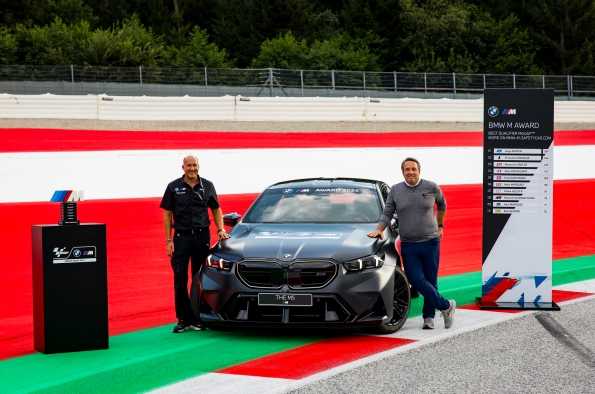 El Red Bull Ring en Spielberg, Austria, sirvió como escenario para la presentación del automóvil para el ganador del BMW M Award 2024. El jueves por la tarde, BMW M GmbH desveló el coche de altas prestaciones con el que se premiará al más piloto más rápido en clasificación en MotoGP™ al final de esta temporada. Será el nuevo BMW M5 (consumo de energía, ponderado, combinado: 1,7 – 1,6 l/100 km y 25,5 – 25,0 kWh/100 km según WLTP; emisiones de CO2, ponderadas, combinadas: 39 – 37 g/km según WLTP; consumo de combustible con batería descargada: 10,3 – 10,2 l/100 km según WLTP; clases de CO2: ponderado, combinado B, con batería descargada G). BMW M GmbH continúa con su tradición de más de 20 años de honrar los logros del ganador del BMW M Award con un premio en forma de un innovador modelo BMW M. El automóvil ganador fue desvelado durante el Gran Premio de Austria de Motociclismo por Dan Rossomondo, Director Comercial de Dorna Sports, titular de los derechos de MotoGP™, y Axel Mittler, Director de Marketing de MotoGP™ en BMW M GmbH.