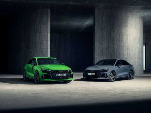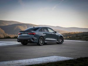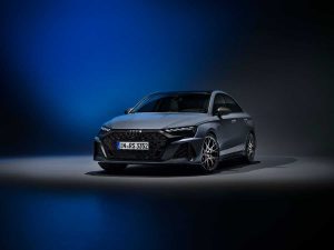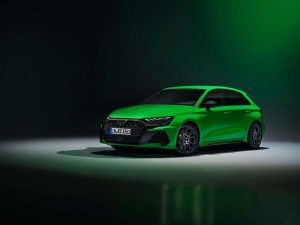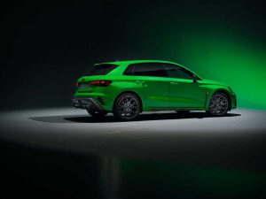 La expresiva carrocería se ve acentuada gracias a los colores exteriores específicos RS Verde Kyalami y Gris Kemora, las nuevas pinturas metalizadas Azul Ascari y Rojo Progresivo y el Gris Daytona, así como el Amarillo Pitón o Negro Mito. El Singleframe y el difusor tienen un acabado negro, que puede ser de alto brillo o mate. El RS 3 equipa de serie llantas de fundición de aluminio de 19 pulgadas en negro mate con un diseño de 5 radios en Y. Opcionalmente, las llantas están disponibles en un diseño inspirado en el automovilismo deportivo, algo ya conocido a través de la edición RS 3 performance, con diez radios en cruz y acabadas en gris oscuro mate o en negro metalizado brillante en acabado bicolor. Los paquetes de carbono y negro de alto brillo que adornan las tomas de aire delanteras, los faldones laterales y la lama sobre el difusor ofrecen aún más individualidad y se complementan con las carcasas de los retrovisores exteriores en el color de la carrocería, negro o carbono.